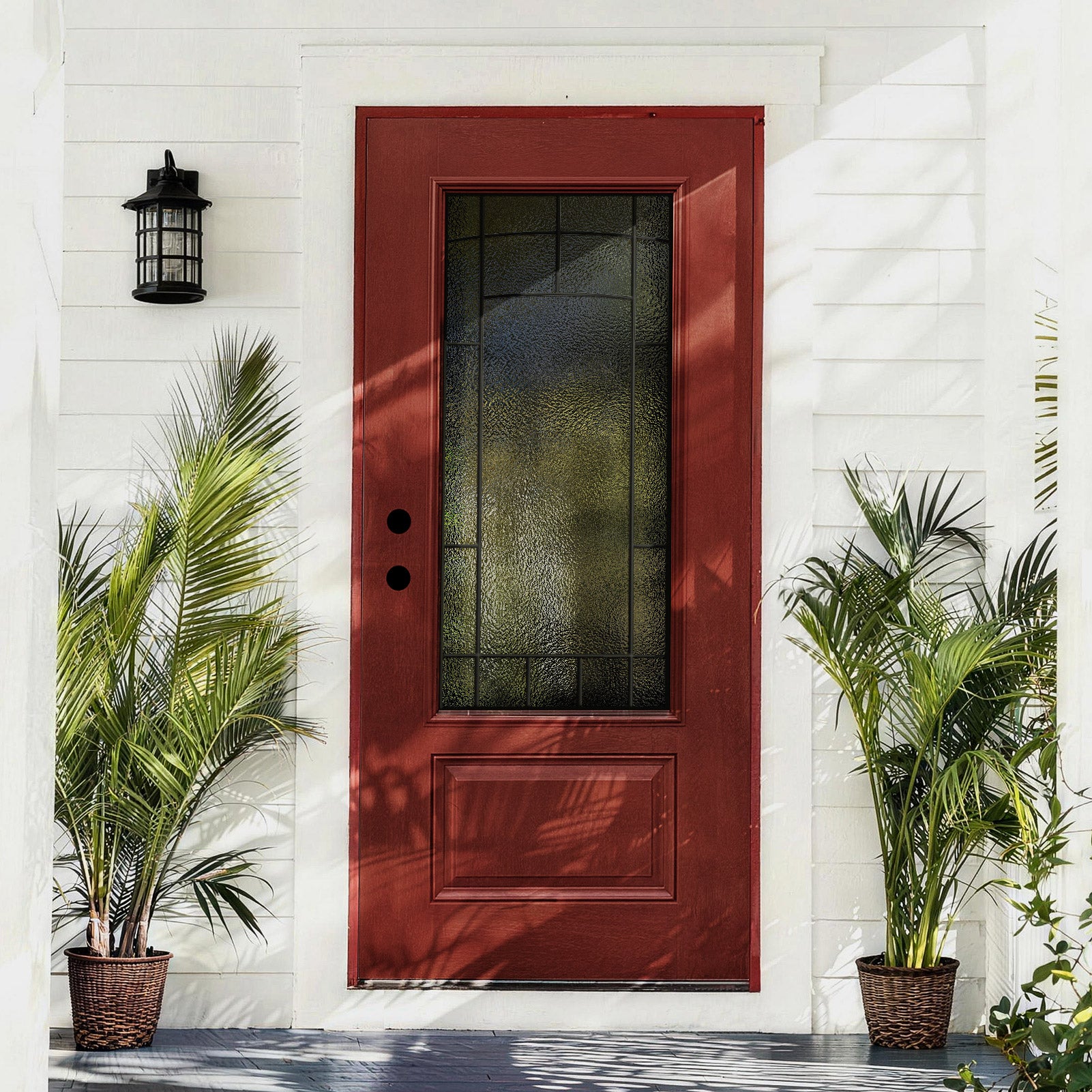 36 x 80 Smooth Fiberglass Entry Door with Brickmould,Vinyl Frame,3/4 View Frosted Glass